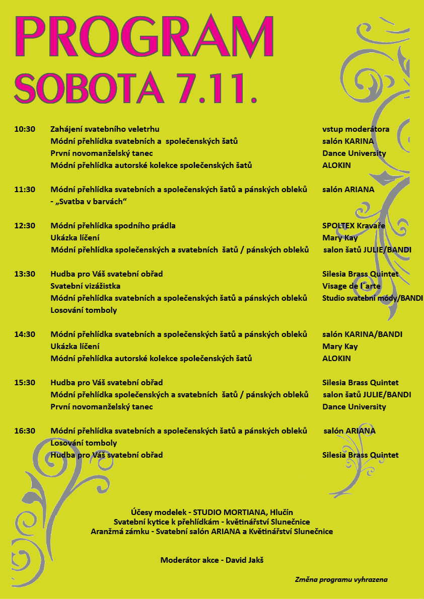 Během této víkendové akce bude připraven také bohatý doprovodný program formou módních přehlídek a zajímavých vstupů profesionálů různých oborů. Nebudou chybět ani soutěže o atraktivní ceny, které věnují vystavovatelé tohoto veletrhu.