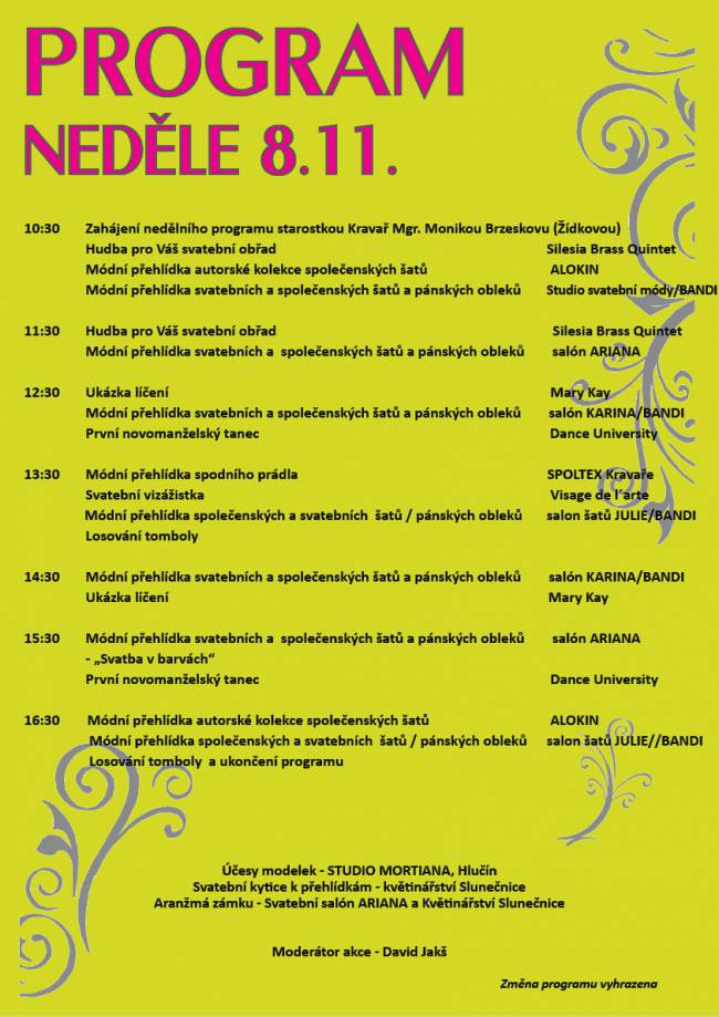 Město Kravaře pořádá a zároveň Vás srdečně zve na již 6. ročník Svatebního veletrhu, který se uskuteční 7. a 8. listopadu 2015 v prostorách kravařského zámku. Jedná se o jediný veletrh svého druhu na Opavsku!